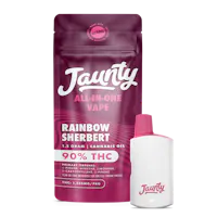 Rainbow Sherbet is a balanced hybrid with a sweet berry and mint flavor, paired with an earthy, fruity aroma. Its high brings an uplifting rush of creativity and focus, perfect for sparking inspiration. Jaunty Palms combine cannabis-derived terpenes with distilled cannabis oil, delivering true-to-strain flavors and effects-driven profiles in a discreet, portable device — ideal for on-the-go use.