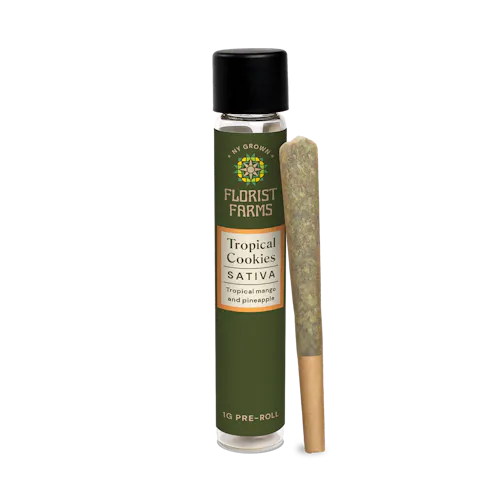 Tropical Cookies | Sativa | 1G Single About This Product Each 1 gram pre-roll contains whole flower — no trim, ever. They're single-sourced, pesticide-free, and rolled right for a smooth pull and a clean burn, just how the plant intended. Effect: Sativa Flavor: Tropical mango and pineapple Ingredients: Whole cannabis flower Why We Love Florist Farms Located in Cortland, NY, Florist Farms is committed to sustainability. They practice regenerative farming by growing in living soil, using organic compost, and never using pesticides. For over a decade, they have been organic vegetable farmers and donate produce weekly to help support their community. Our friends at Florist Farms are deeply committed to quality and to delivering the cleanest cannabis products in New York State. Whole Flower • No artificial flavoring • No Pesticides • Non-GMO • 100% Pure Cannabis